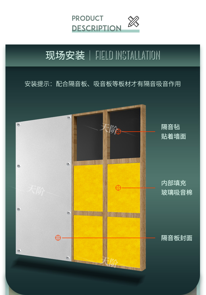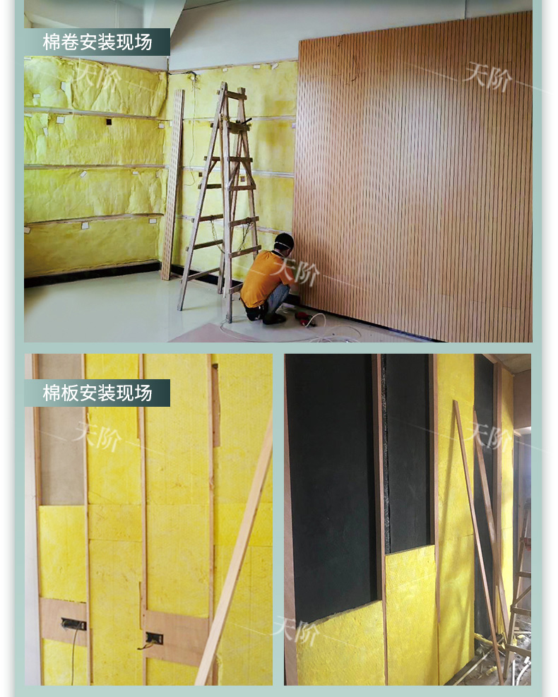 離心玻璃棉內部纖維蓬松交錯,存在大量微小的孔隙,是典型的多孔性吸聲材料,具有良好的吸聲特性。離心玻璃棉可以制成墻板、天花板、空間吸聲體等,可以大量吸收房間內的聲能,降低混響時間,減少室內噪聲。