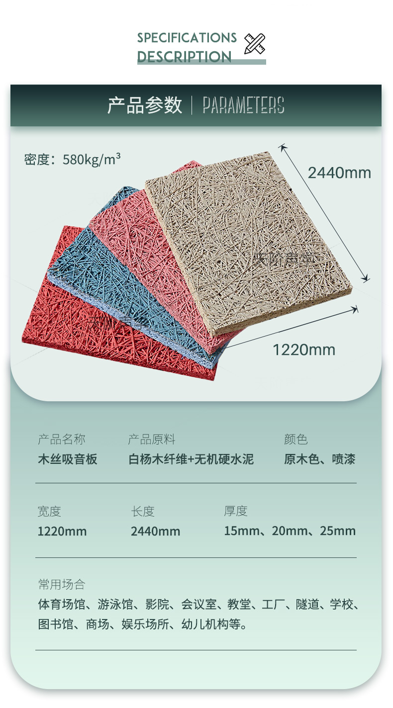 木絲吸音板的表面紋理表現(xiàn)出高雅質(zhì)感與獨特品味,可充分演繹設(shè)計師的創(chuàng)意和理念。該產(chǎn)品結(jié)合了木材與水泥的優(yōu)點:如木材般質(zhì)輕,如水泥般堅固,具有吸音、抗沖擊等多種功能,可廣泛應(yīng)用于體育場館、劇場、影院、會議室、教堂、學(xué)校、圖書館、游泳館等處。