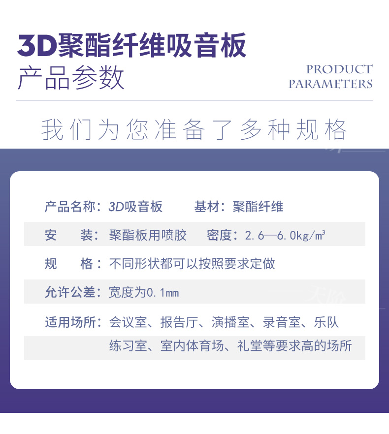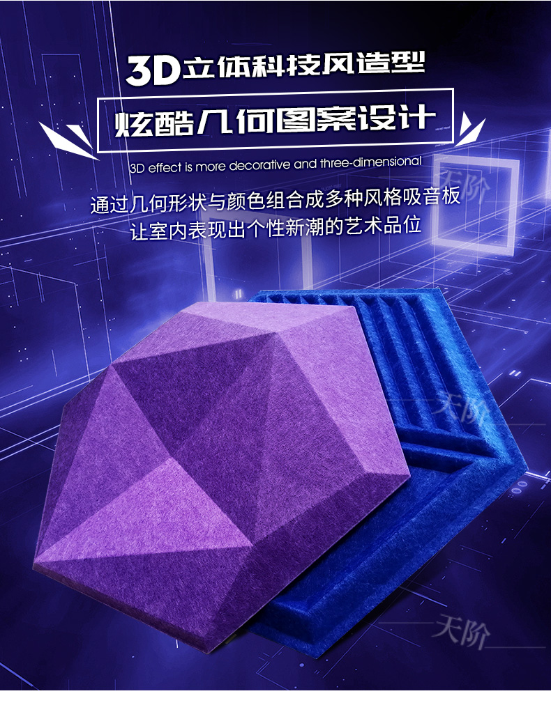 3D聚酯纖維吸音板是今年新研發產品,采用的是綠色環保高新技術熱壓合成繭棉形狀的纖維板材,具有環保,防火,吸音,3D效果裝飾性更立體,易安裝等功能。