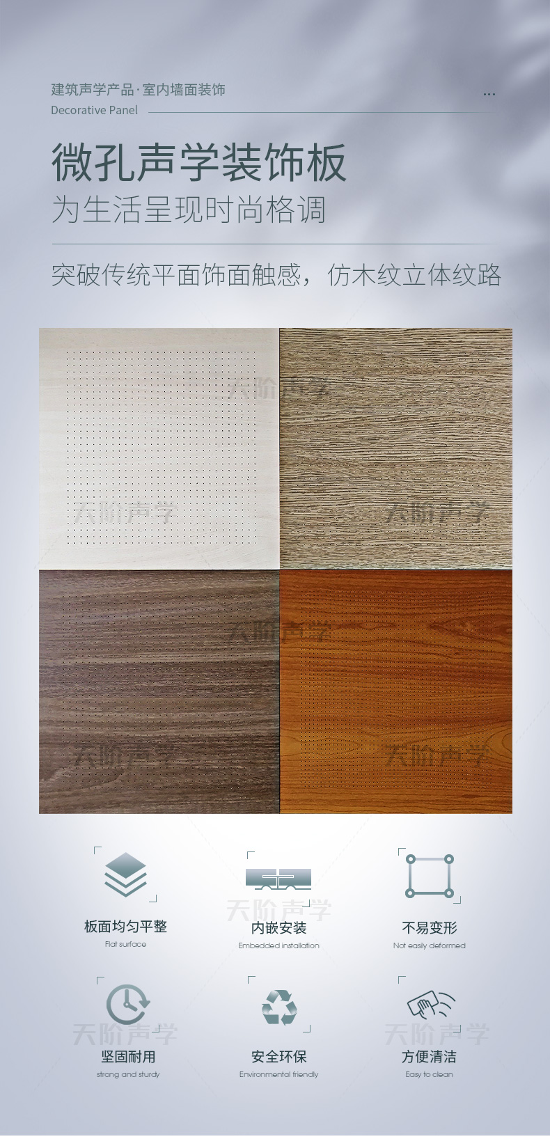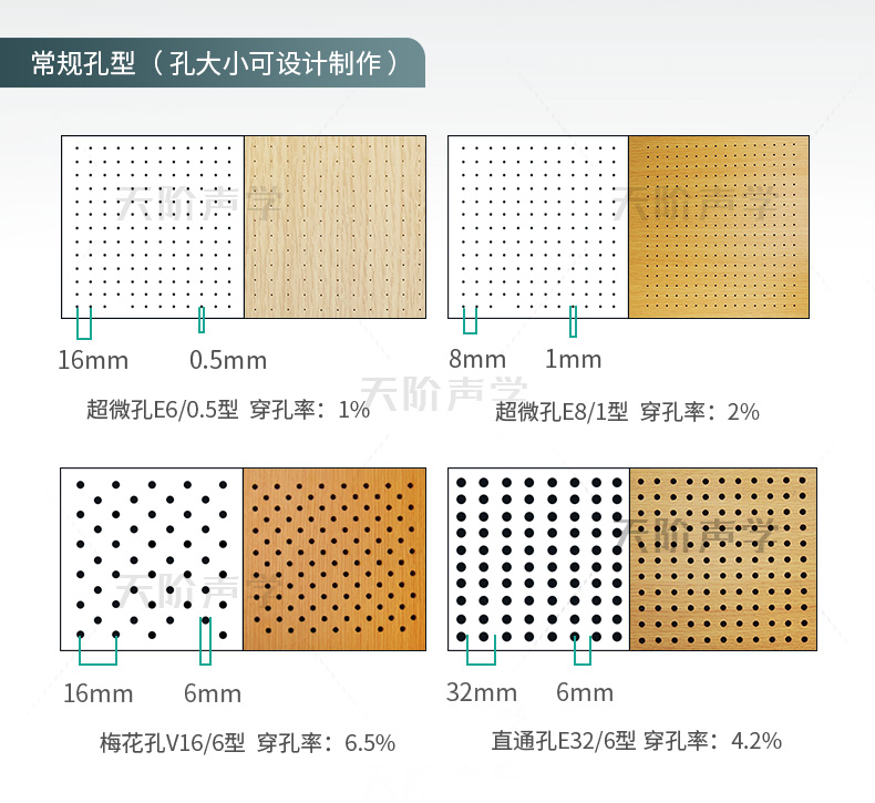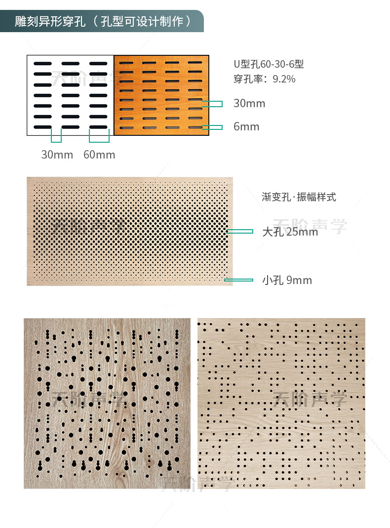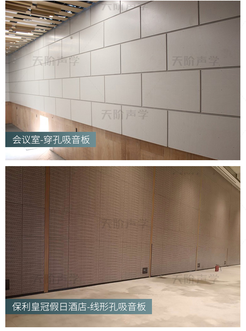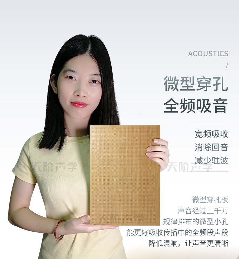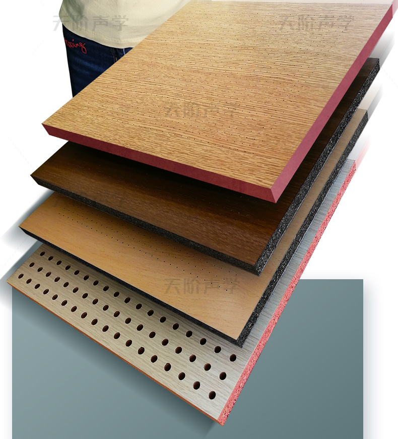 孔木吸音板是一種在密度板上直接穿孔的共振吸聲材料。孔木吸音板對(duì)吸聲頻譜選擇性較強(qiáng),對(duì)低頻有很好的吸聲性能。如在吸聲結(jié)構(gòu)后空腔上填入適量的吸聲棉可提高中、高頻吸聲效果。 我們的孔木吸音板: 天階聲學(xué)孔木吸音板采用高質(zhì)的中纖板、具有環(huán)保、防火、防潮等性能,飾面顏色及材料選擇性廣,能很好地滿足客戶多樣化的聲學(xué)及裝飾需求。較槽木吸音板,孔木吸音板相對(duì)抗撞擊能力強(qiáng)。