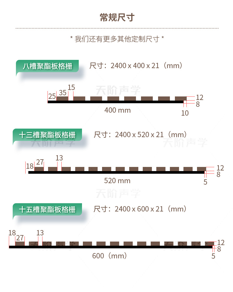 尺寸:2400 x 400 x 21mm、2400 x 520 x 21mm、2400 x 600 x 21mm(或定制尺寸)