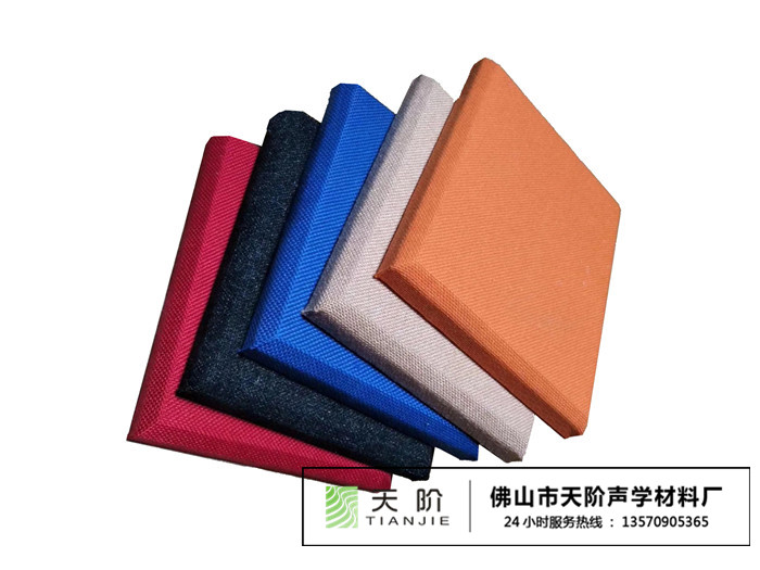 2、布藝吸音板(軟包):布藝吸音板又叫吸音軟包,采用阻燃樹脂邊框或木質邊框或鋁質邊框內放置,防火的特物吸聲棉,外包防火吸聲布藝或環保皮,牛皮等制成。防火處理后達到國家級防火要求。天階聲學生產的布藝吸音板,具有環保、防火、吸聲頻帶寬、裝飾性強、施工簡單,無粉塵污染等性能,飾面顏色及材料選擇性廣。