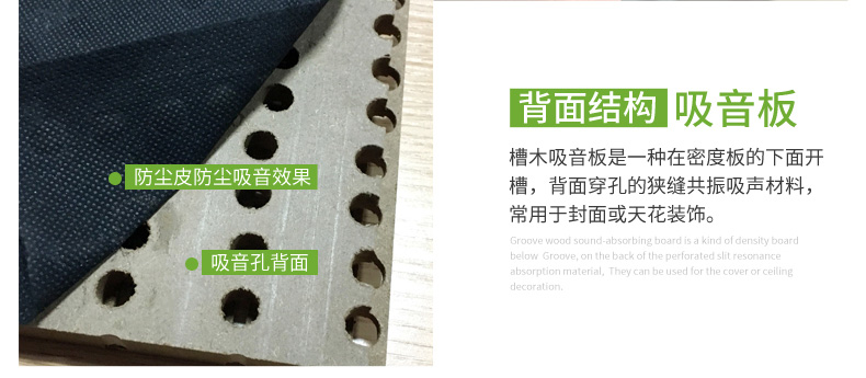 穿孔木質(zhì)吸音板是一種在密度板上直接穿孔的共振吸聲材料。穿孔木質(zhì)吸音板對吸聲頻譜選擇性很強(qiáng),對中低頻有很好的吸音性能。如在吸聲結(jié)構(gòu)后空腔上填入適量的吸聲棉可提高中、高頻的吸聲效果。